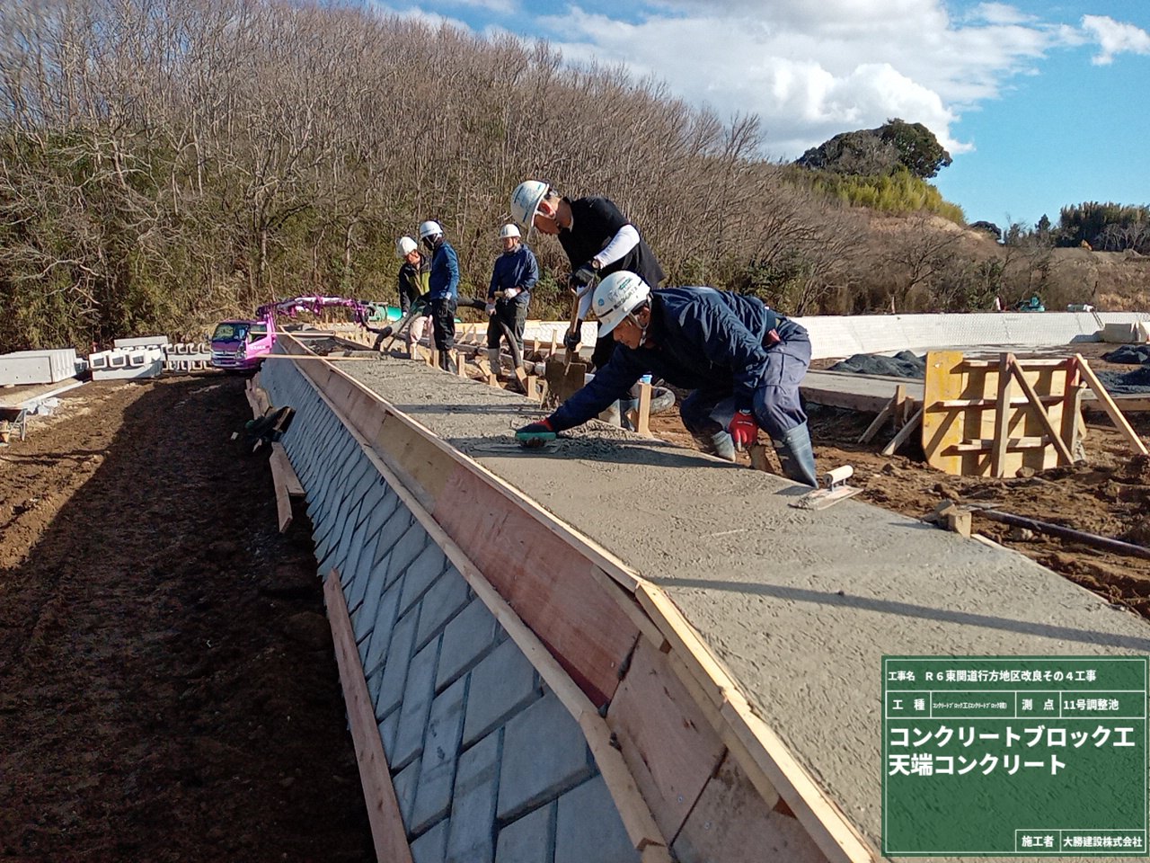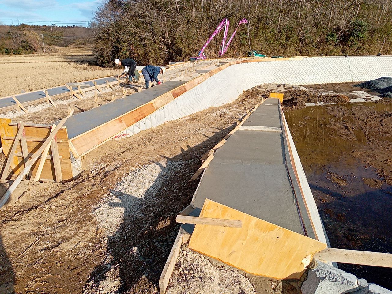 さらに手前の2人が息を合わせて表面を均し、きれいな天端コンクリートが姿を現しました👏