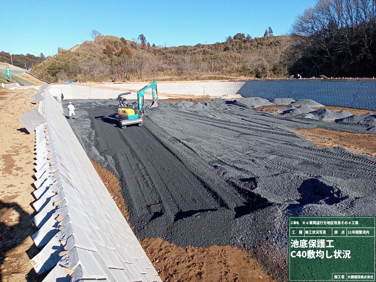 調整池の池底保護工として、C-40砕石の敷均しが完了しました。