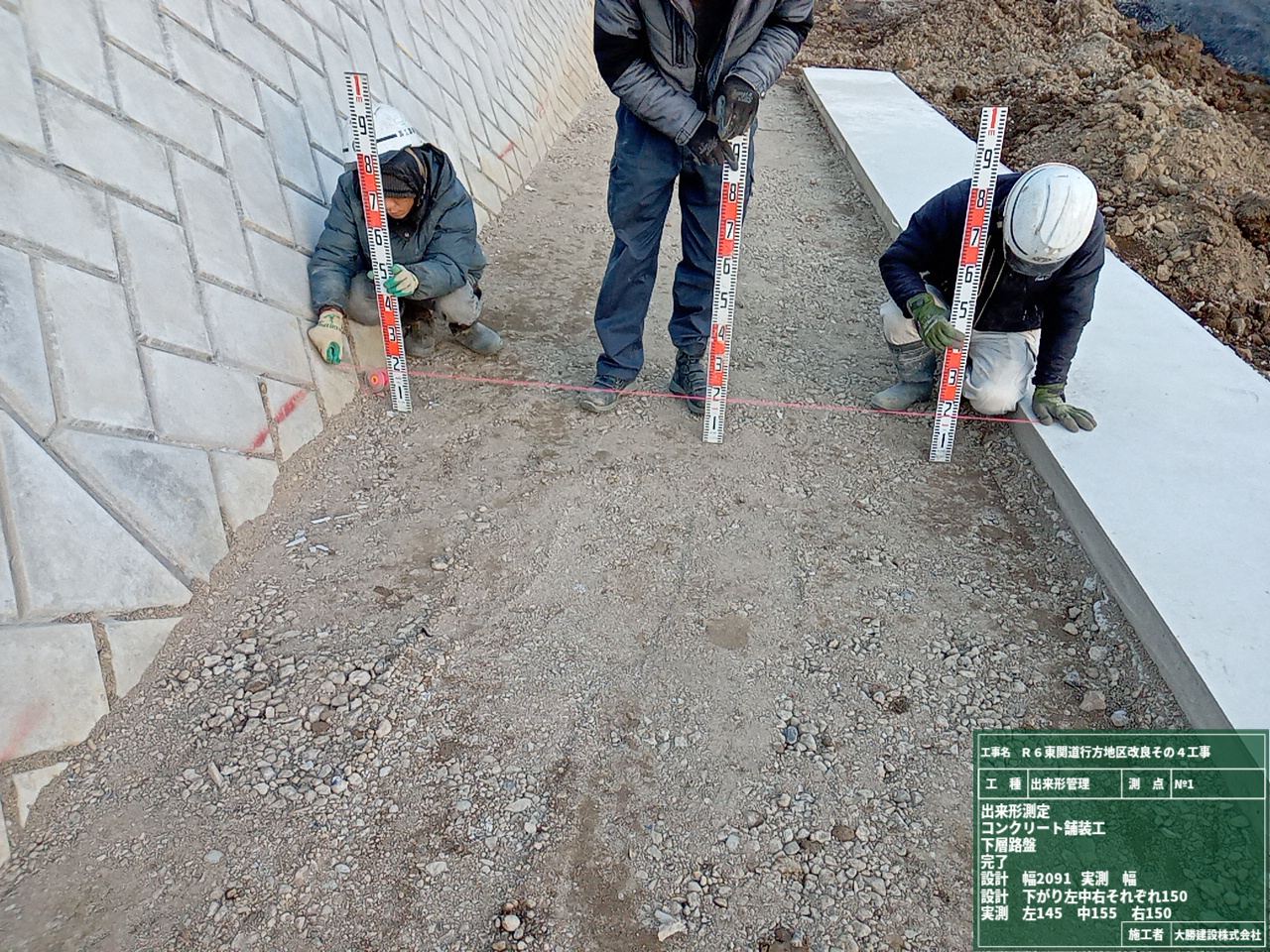 下層路盤転圧後は、この墨出し位置から何センチ下がっているかを測定し、設計どおりの高さで施工できているか、出来形確認を行っていきます。